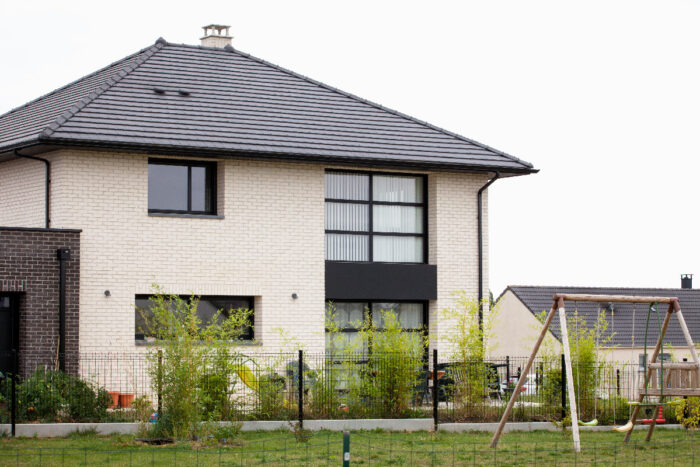Maison traditionnelle et moderne en briques rouge, typique du Nord-Pas de Calais. Maison connectée avec terrasse à l’étage. Contactez-nous ! LES ESSENTIELS – Maison de 158m²– 4 chambres dont une suite parentale– 2 salles de bains– terrasse à l’étage– connectée
