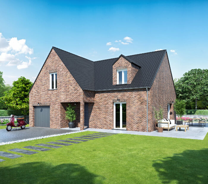 Maison traditionnelle connectée en briques rouge dessinée par Groupe Maisonneuve. Faites construire la maison de vos rêves en Nord-Pas de Calais ! LES ESSENTIELS – Maison de 255m²– 5 chambres dont 2 suites– 2 salle de bains– connectée